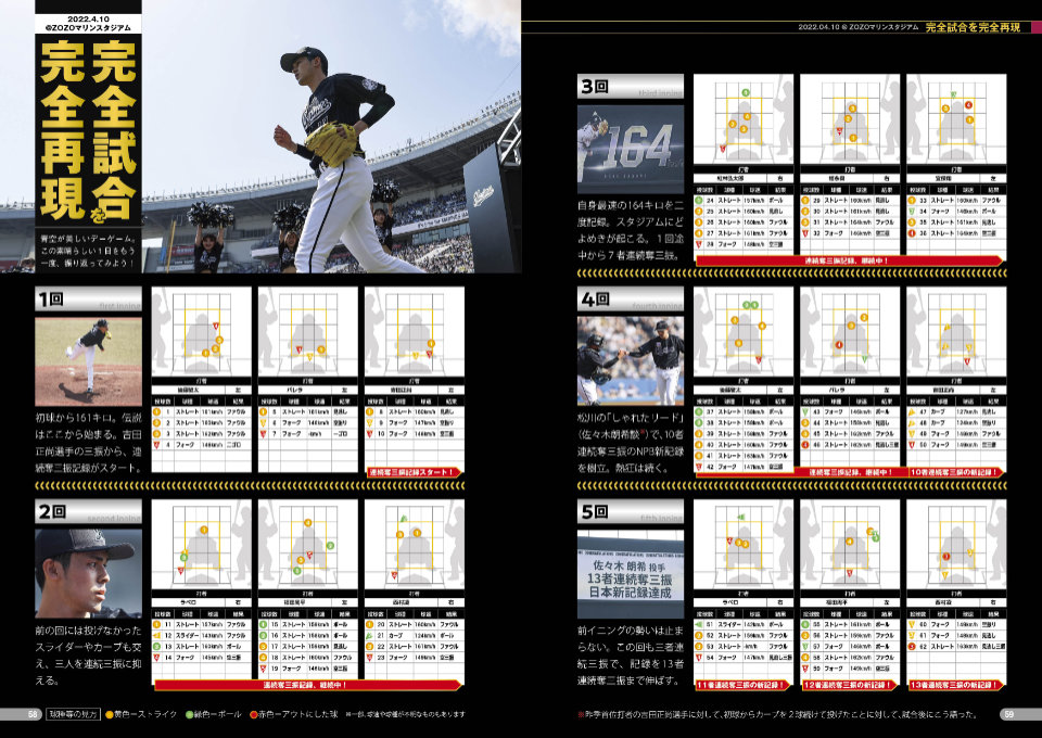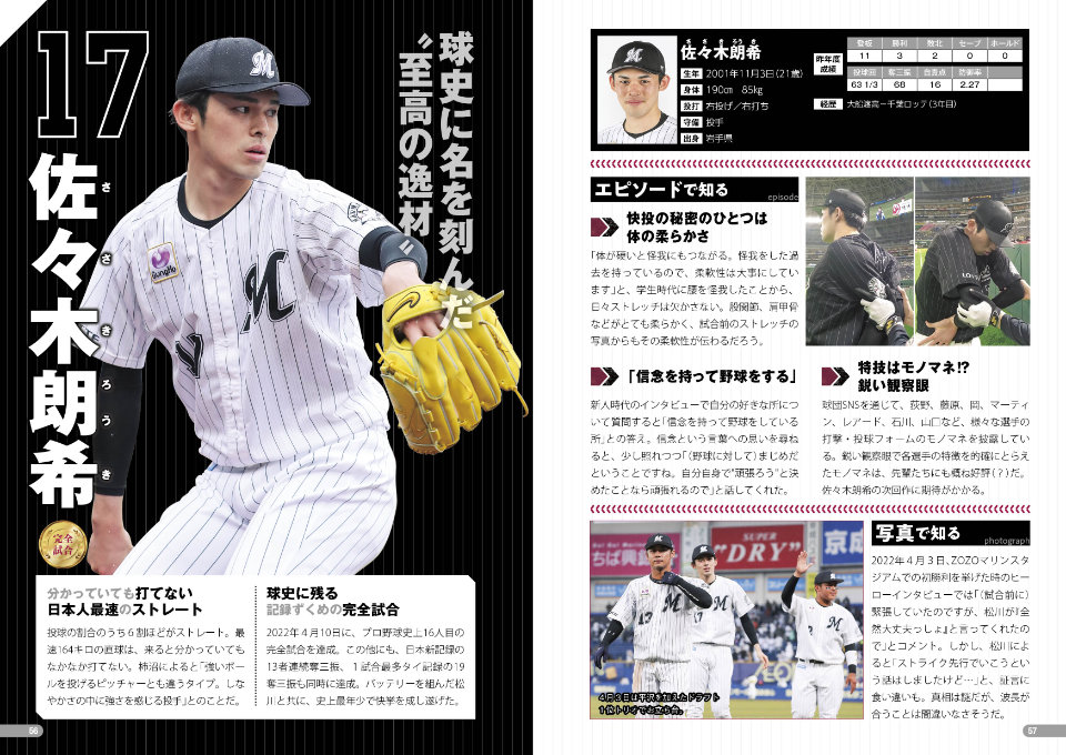佐々木朗希選手の完全試合を完全再現した特集、現役選手の入団当時の姿をふりかえる写真特集、改築された新・選手ロッカールームの特集、選手を学年別にまとめた学年別早見表など、情報満載で、マリーンズのことがわかります!