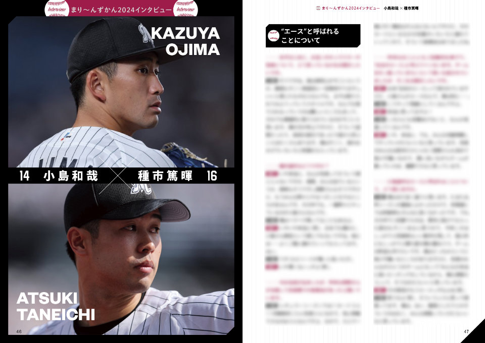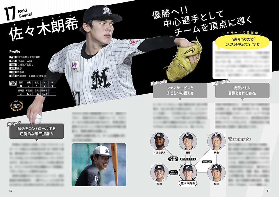 育成選手を含むマリーンズの全選手が選手1名につき、2ページに渡って紹介されています。