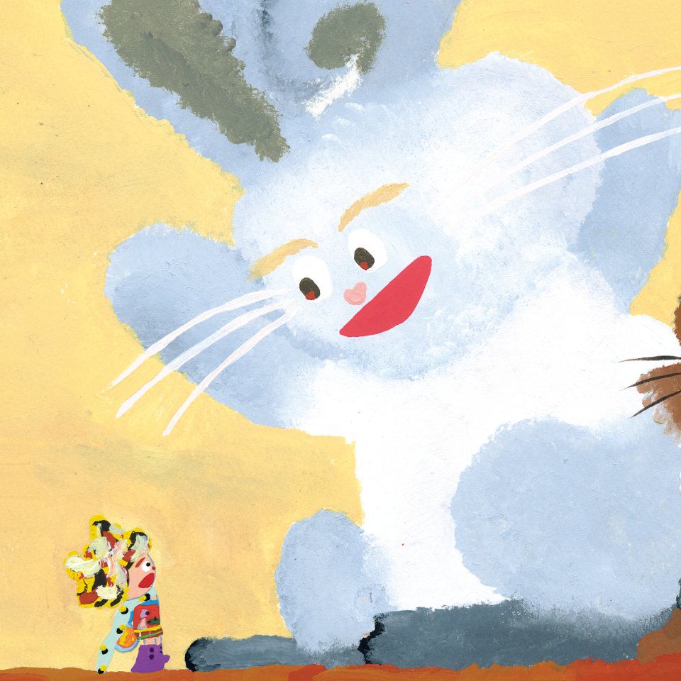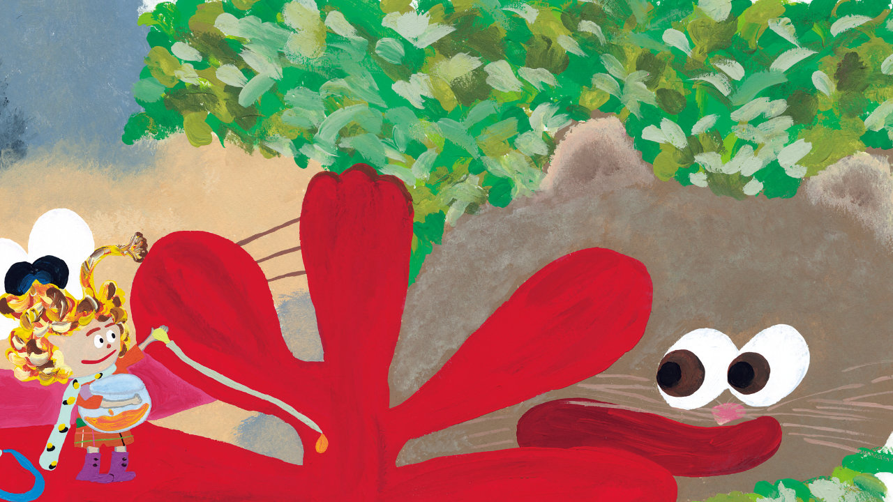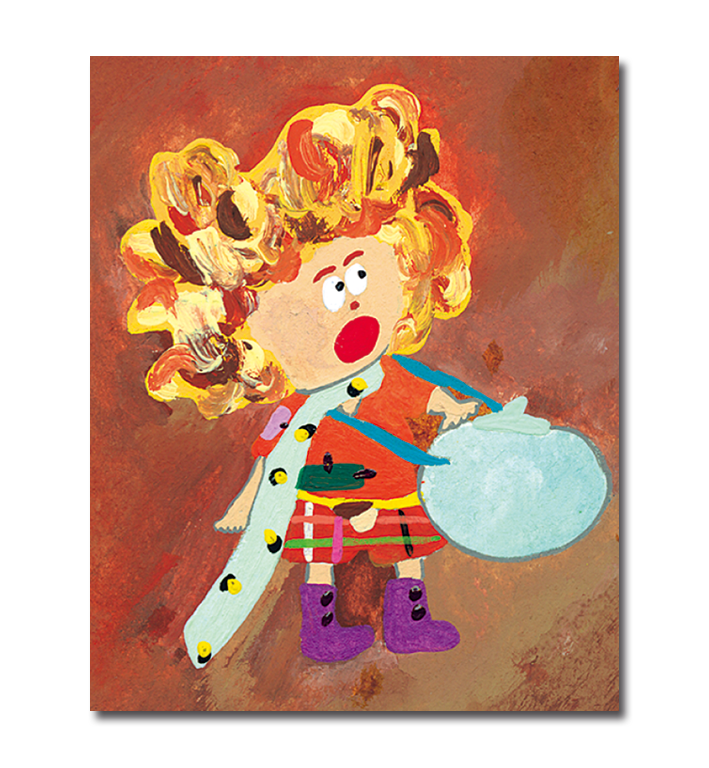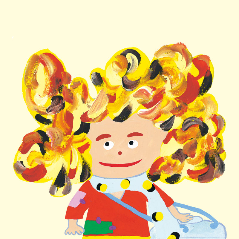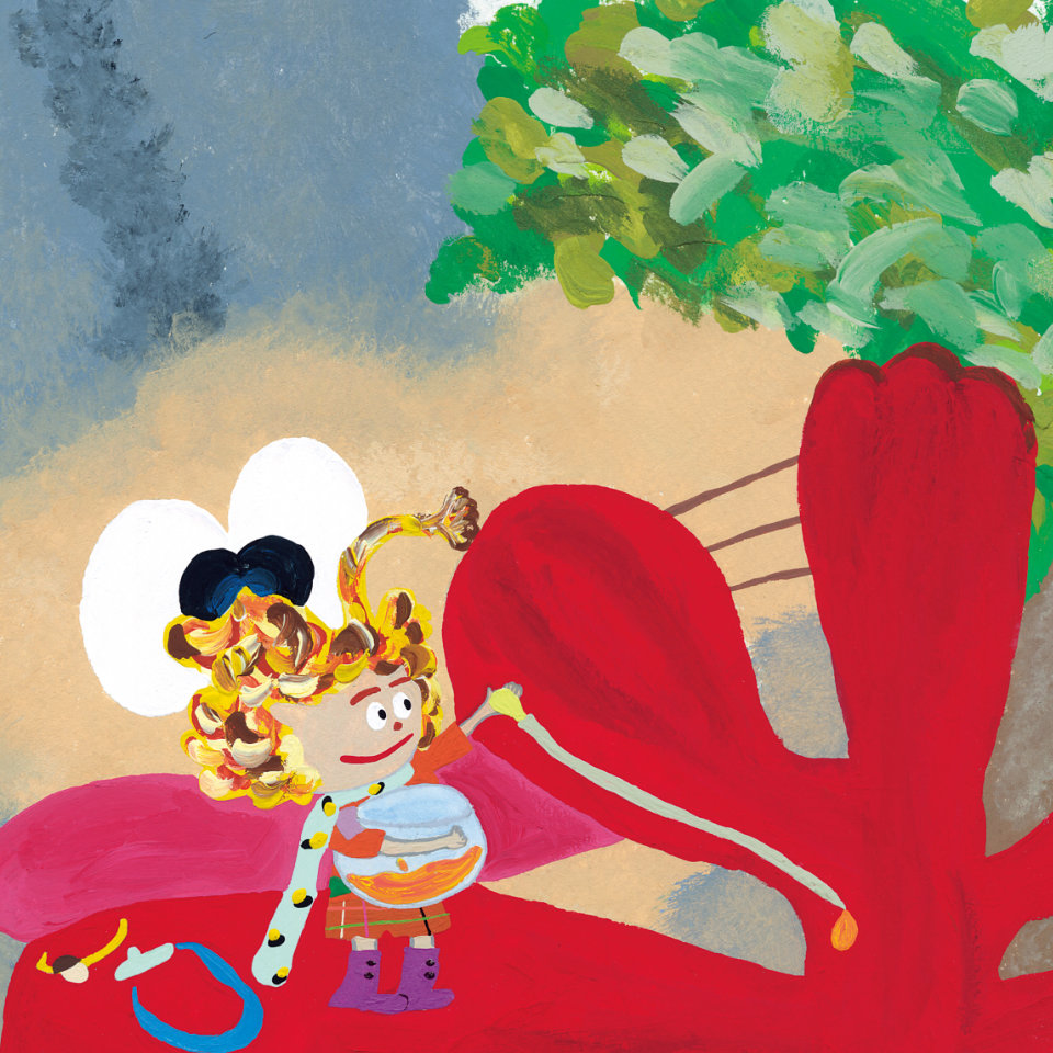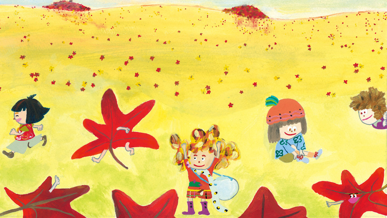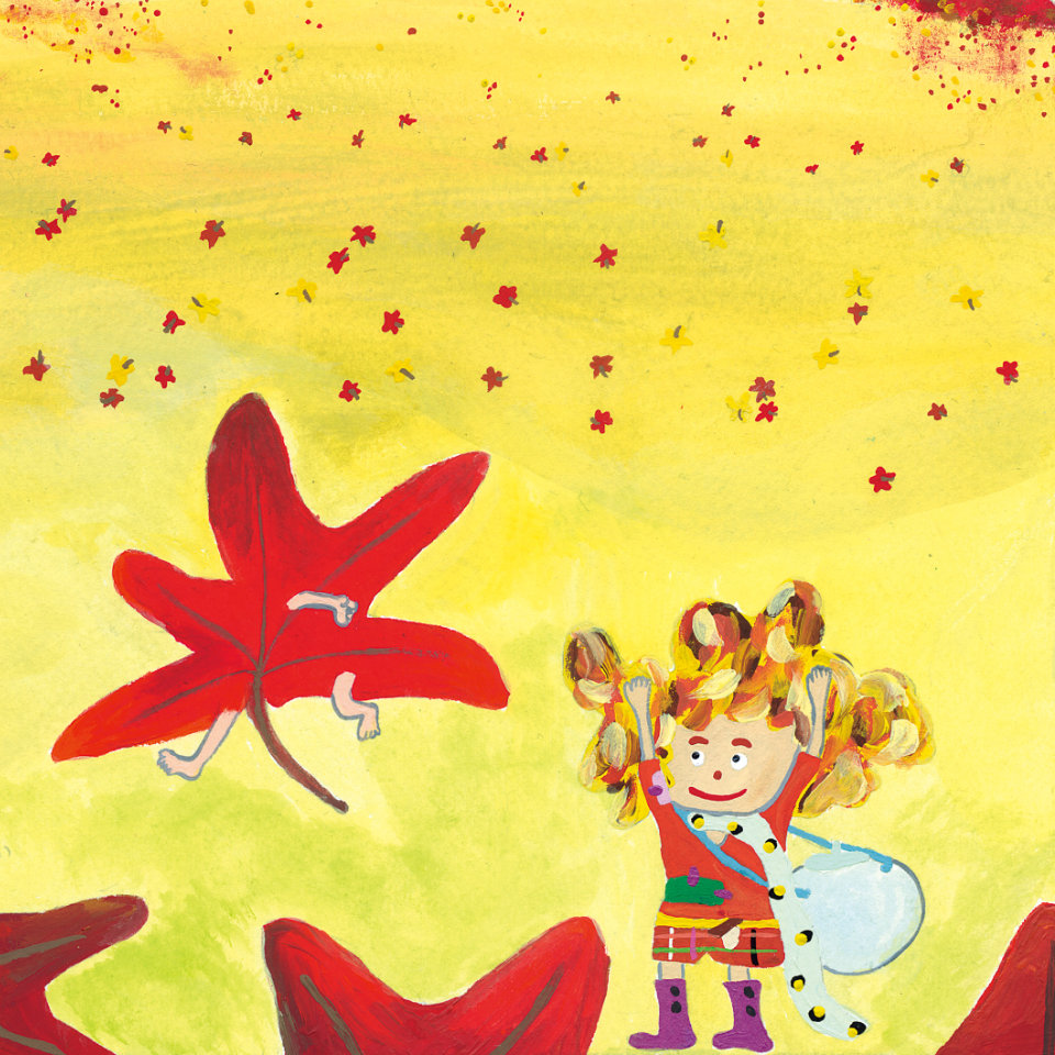 もみじの落ち葉から生まれた“こびと”リリア。好奇心旺盛だけど、少しのんびりした性格。サルビアの花の蜜を集めて暮らしている。ふわふわの髪の毛に秘密がある!?