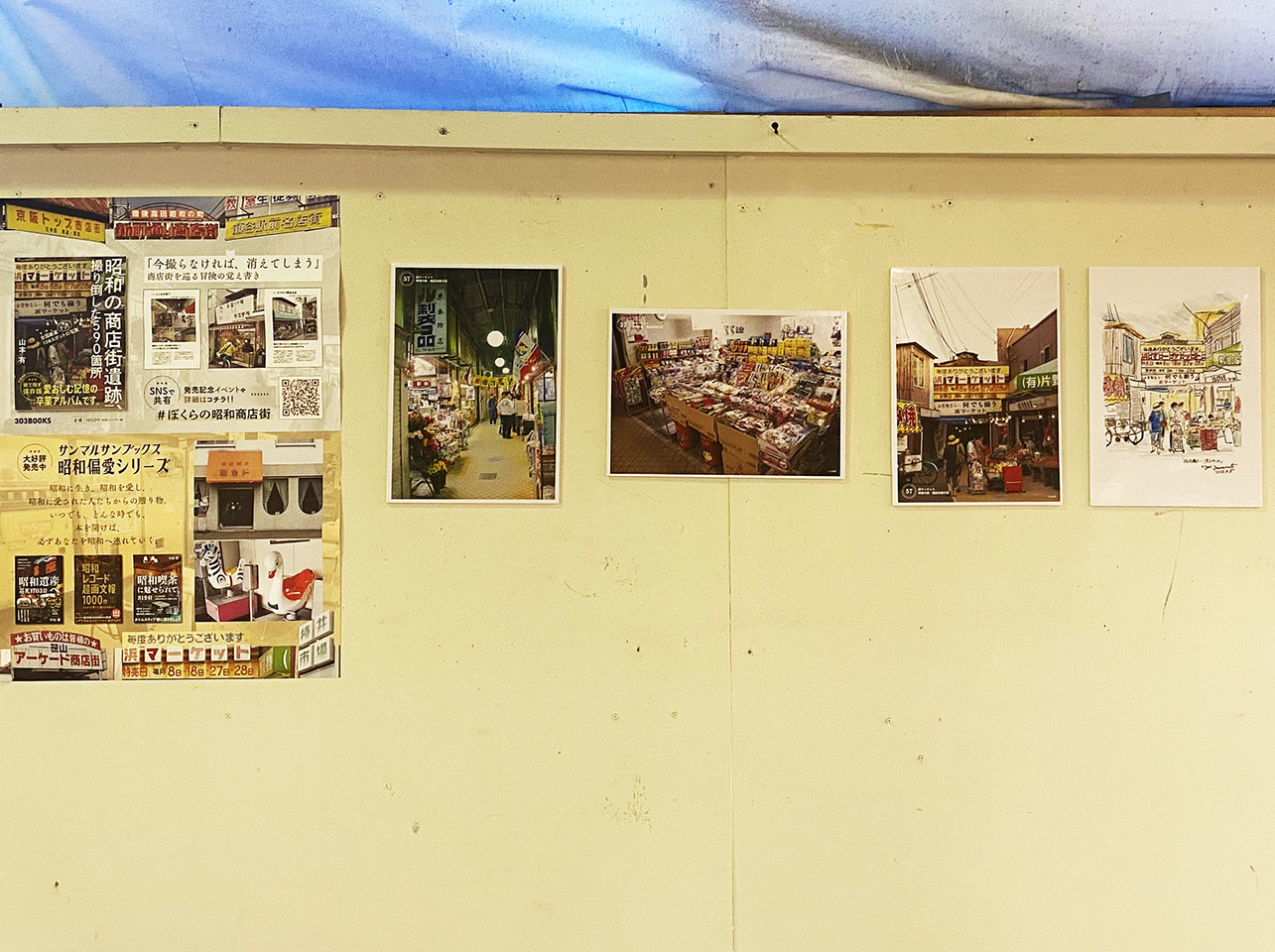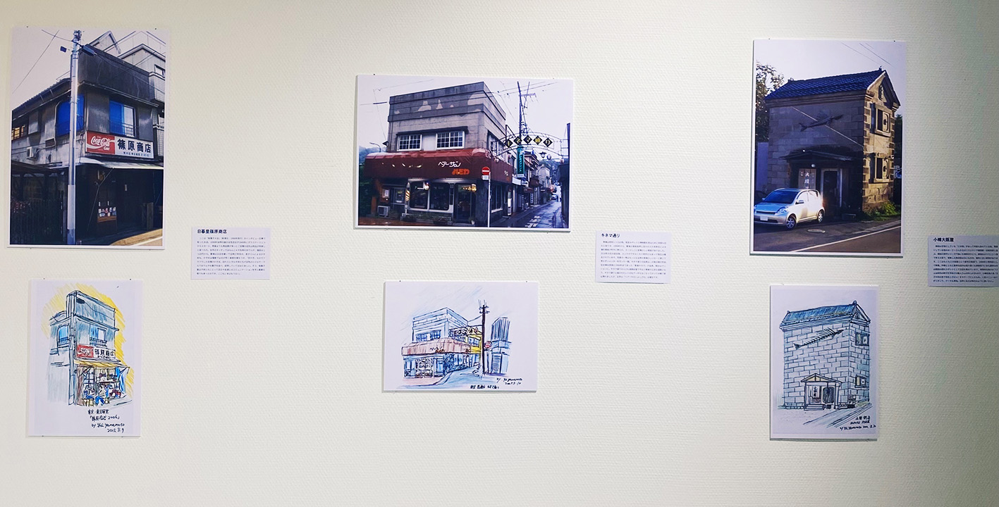 著者 山本有氏直筆のイラストと、山本有氏が撮影した商店街の写真を並列で展示します。